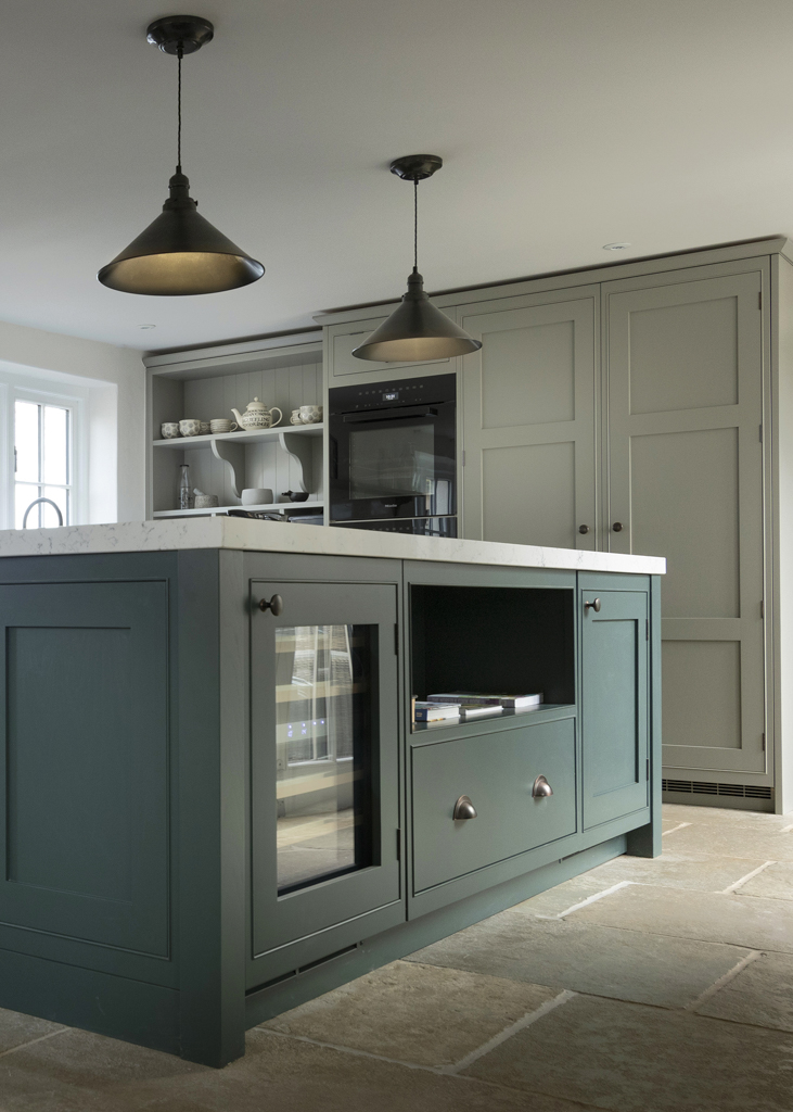 For the main kitchen we’ve used in-frame shaker cabinetry with feature cockbeading from our Holkham Collection.  The perimeter cabinets have been painted in a French Grey with the stunning centre island finished in Squid Ink, an elegant charcoal blue hue. Stylish brushed copper knobs and cup handles were selected to match the modern farmhouse style of the design.