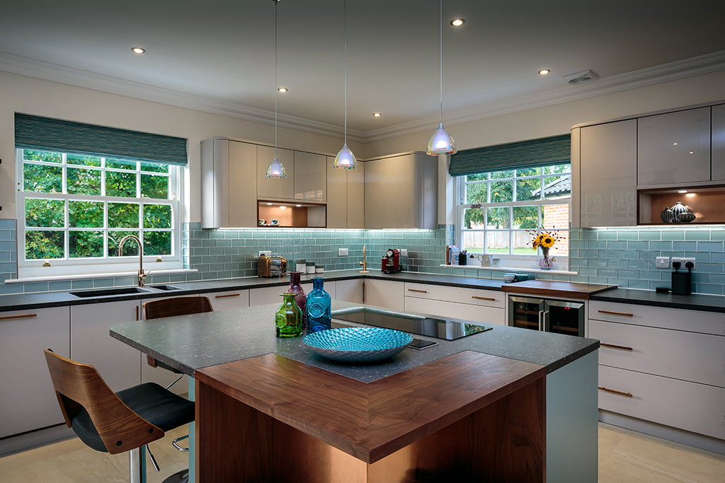 We were keen to have a handmade, bespoke kitchen which combined excellent functionality with creativity. The amazing Kestrel designer listened carefully to our thoughts and tastes and helped lead us cleverly to the theme of copper, walnut. glass and natural stone with splashes of blues amongst a more neutral base. Our initial ideas were translated into this stunning kitchen which is warm and welcoming, quirky and unique. We especially love the walnut and copper corner of the island along with the eye-catching  inserts which are lit to highlight their beauty. The lay-out of the kitchen was well thought through with all units and appliances of the highest standard. The whole Kestrel team have been professional and extremely helpful throughout the design and installation process. We would highly recommend them and their products.