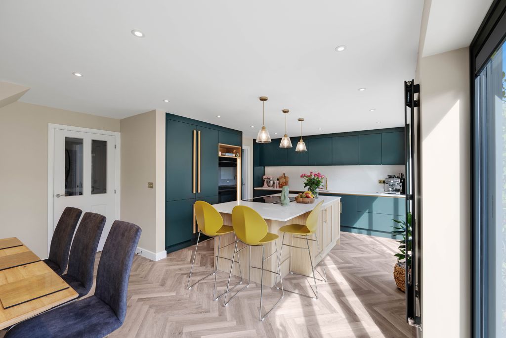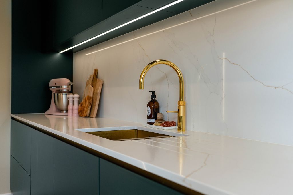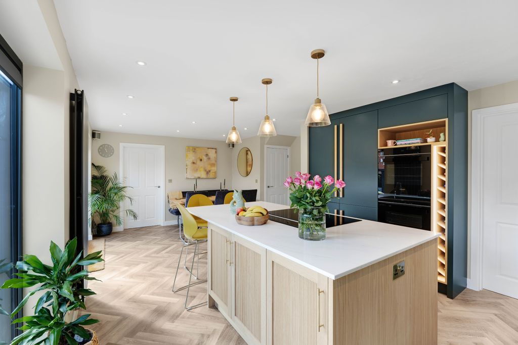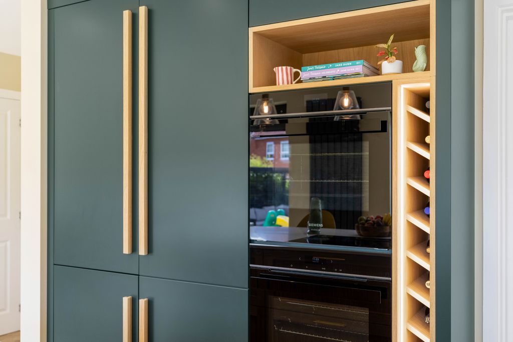 To create cohesion, accents of chalked oak are echoed throughout the space, seamlessly tying the two elements together and adding warmth and character to the room. The look is completed with Siemens IQ700 appliances and a gold Quooker tap, bringing together performance and style in a truly show-stopping kitchen.