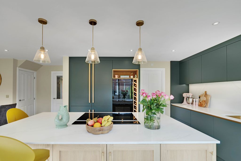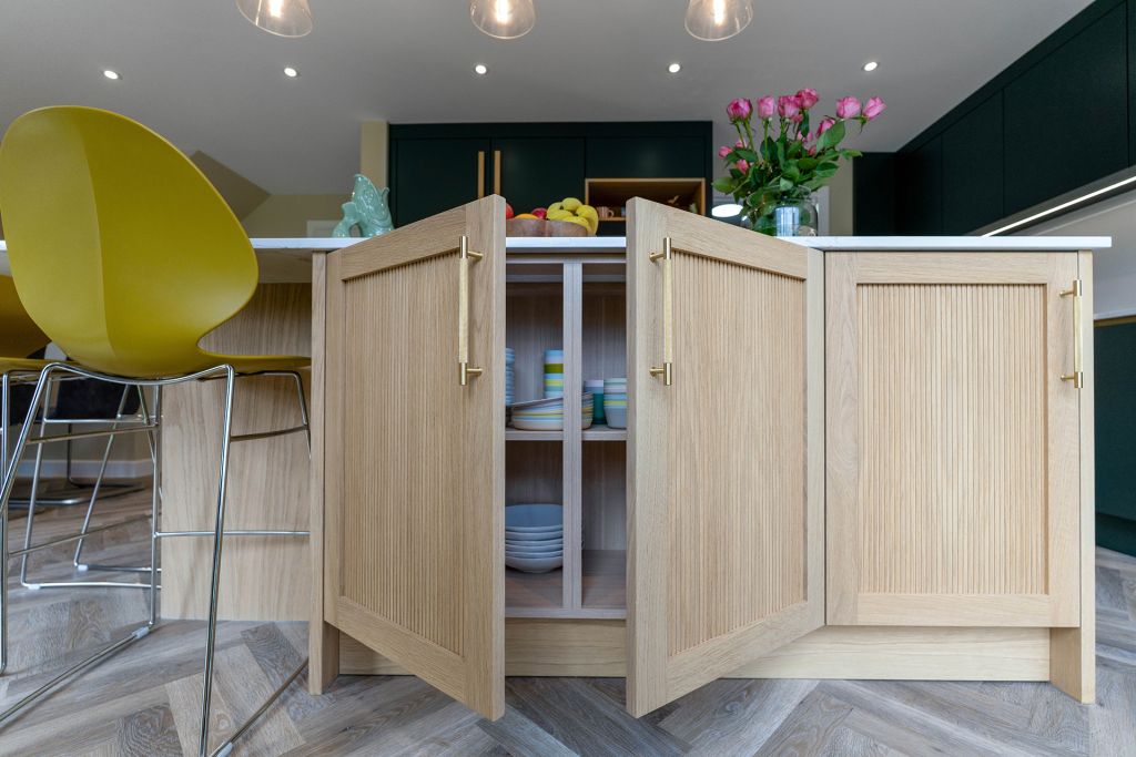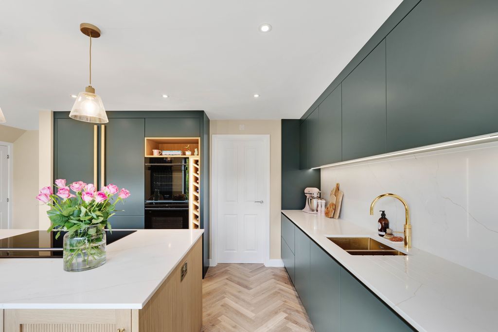 This kitchen pairs cabinetry from our Marriott collection, painted in Farrow & Ball’s Studio Green, with a statement oak island featuring a contemporary take on the classic Shaker door. The island is stained in a refined chalked finish and dressed with Croft & Assinder gold handles for a touch of understated luxury.