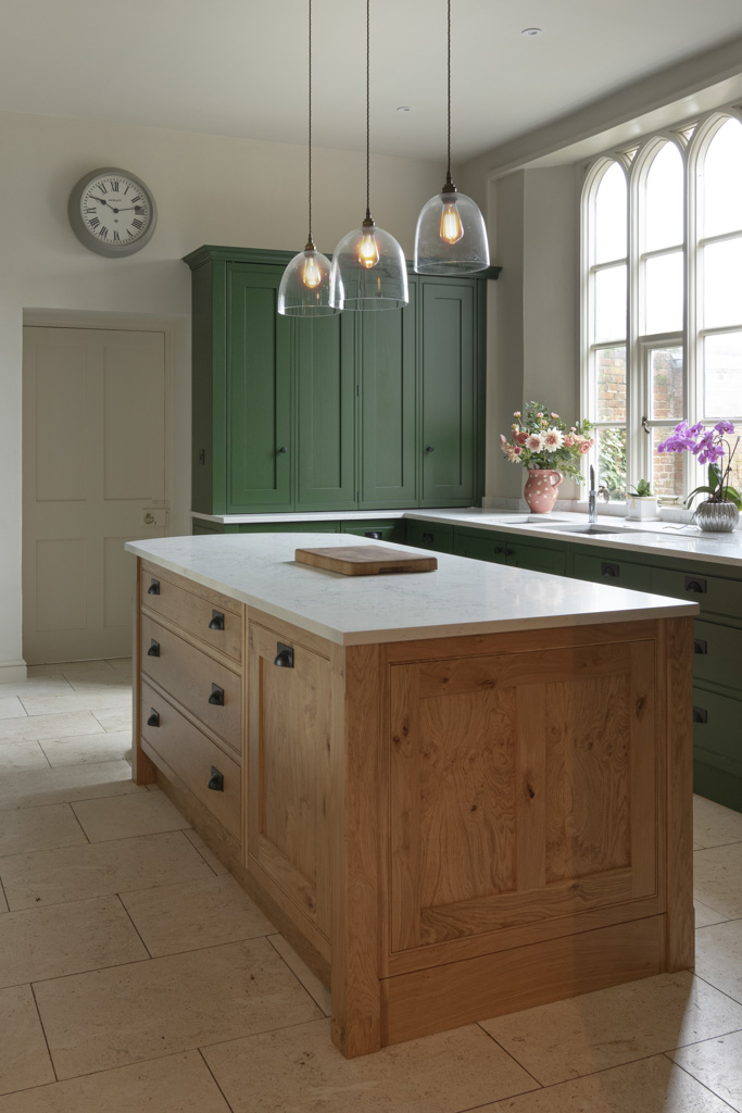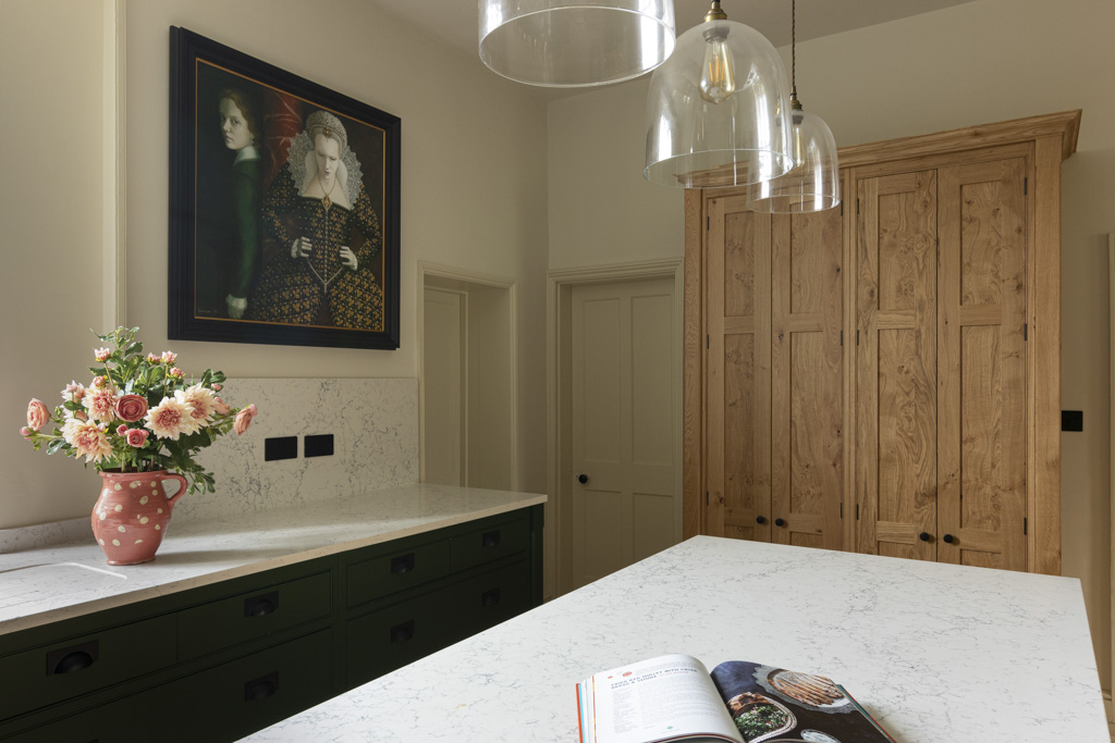 Farrow and Ball’s Beverly shade, a deep green hue, was chosen for the painted cabinetry and the centre island and full height unit was finished in a natural cats paw oak that adds stunning character graining to the design. Hardwearing, luxurious Caesarstone worktops were fitted throughout.