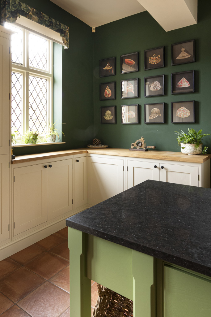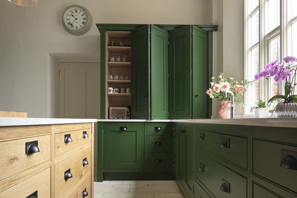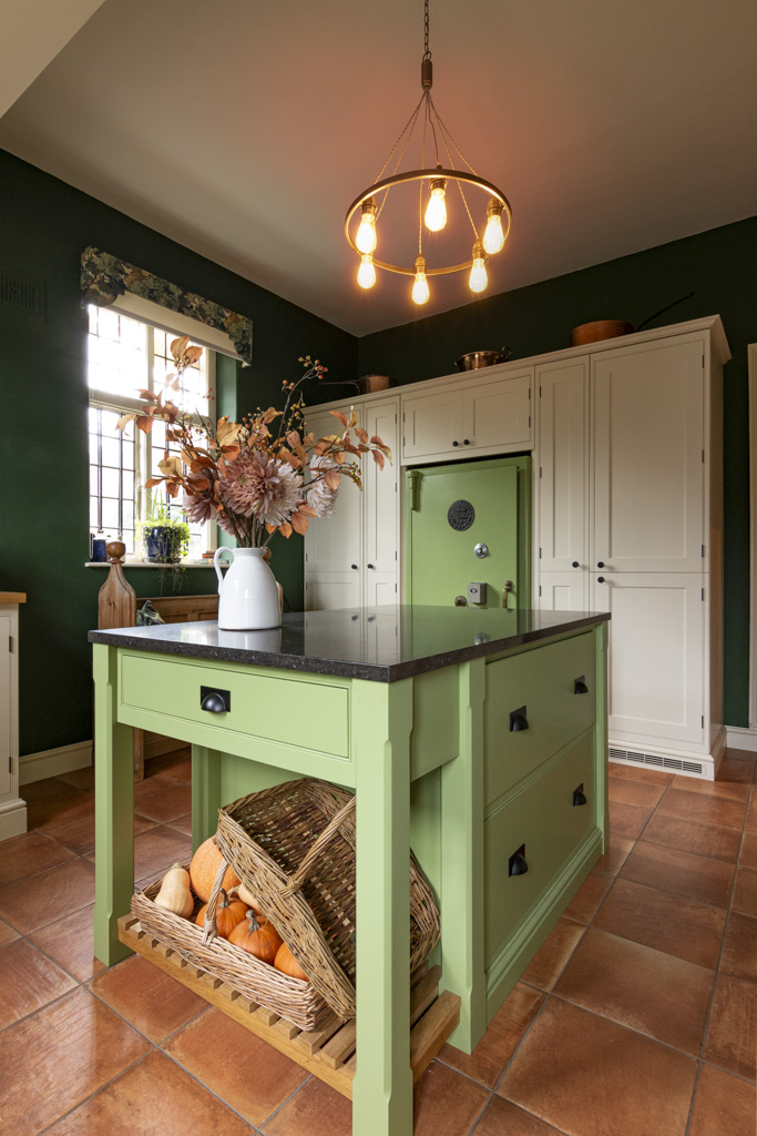 An antique unused safe was repositioned to the centre of the wall and painted to match the cabinetry – Farrow and Ball Yearbridge Green, a contemporary bright avocado green colour.